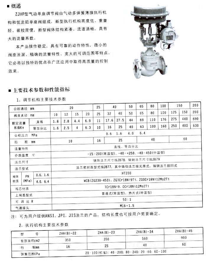 ZJHP型氣動(dòng)單座調(diào)節(jié)閥由氣動(dòng)多彈簧薄膜執(zhí)行機(jī)構(gòu)和低流阻單座閥組成。新型執(zhí)行機(jī)構(gòu)高度低、重量輕、裝校簡(jiǎn)便,新型閥體結(jié)構(gòu)緊湊、流道通暢,具有大的流量系數(shù)。